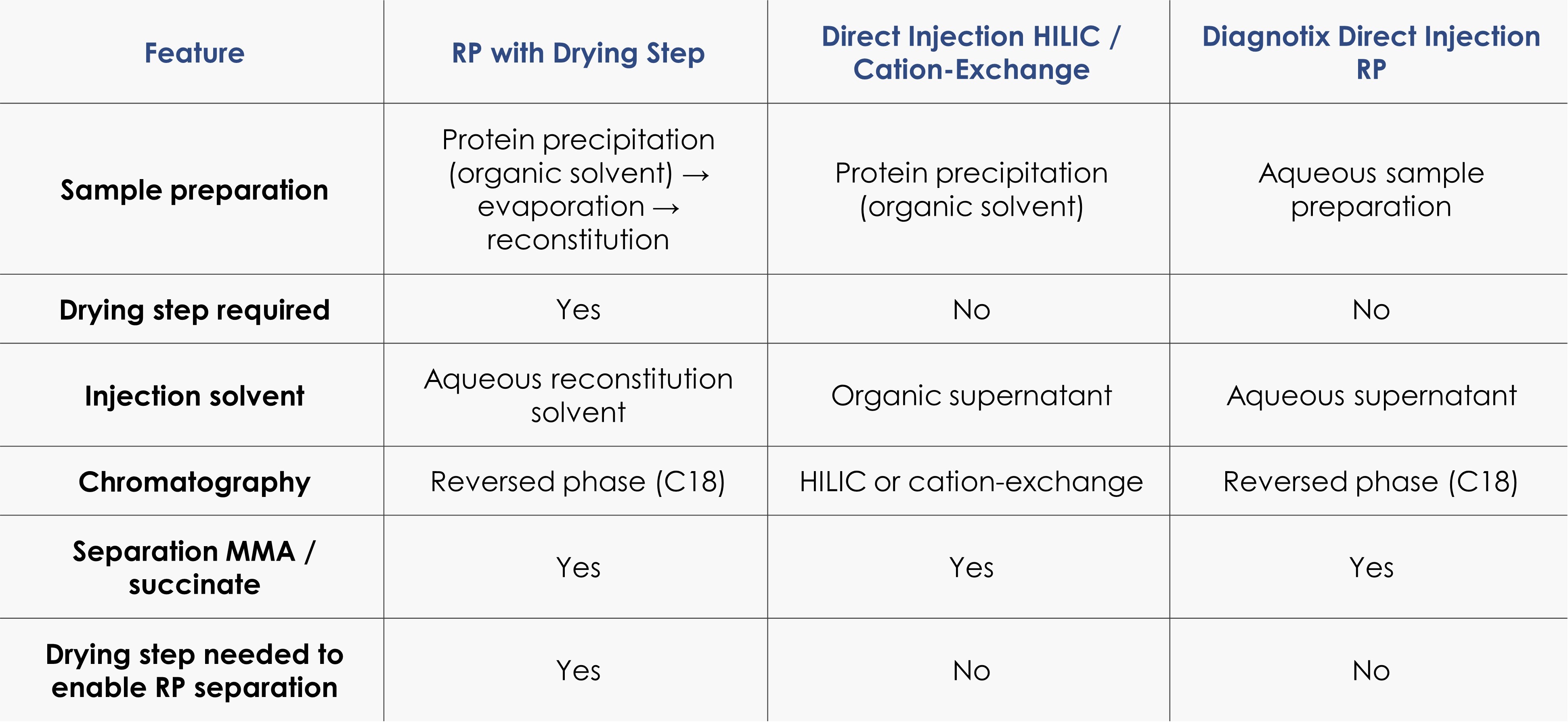 Onder deze omstandigheden worden sterk polaire verbindingen zoals methylmalonzuur en succinylzuur slecht vastgehouden op reversed phase kolommen. Daarom maken laboratoria doorgaans gebruik van één van twee strategieën.